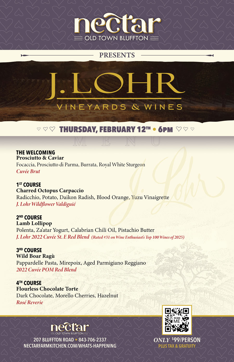 Join us at Nectar Farm Kitchen in Old Town Bluffton for an unforgettable wine dinner featuring J. Lohr Vineyards & Wines. Indulge in a four-course menu (plus a welcoming course) masterfully created by our culinary team, each course thoughtfully paired with world-class wines from J. Lohr Vineyards & Wines.